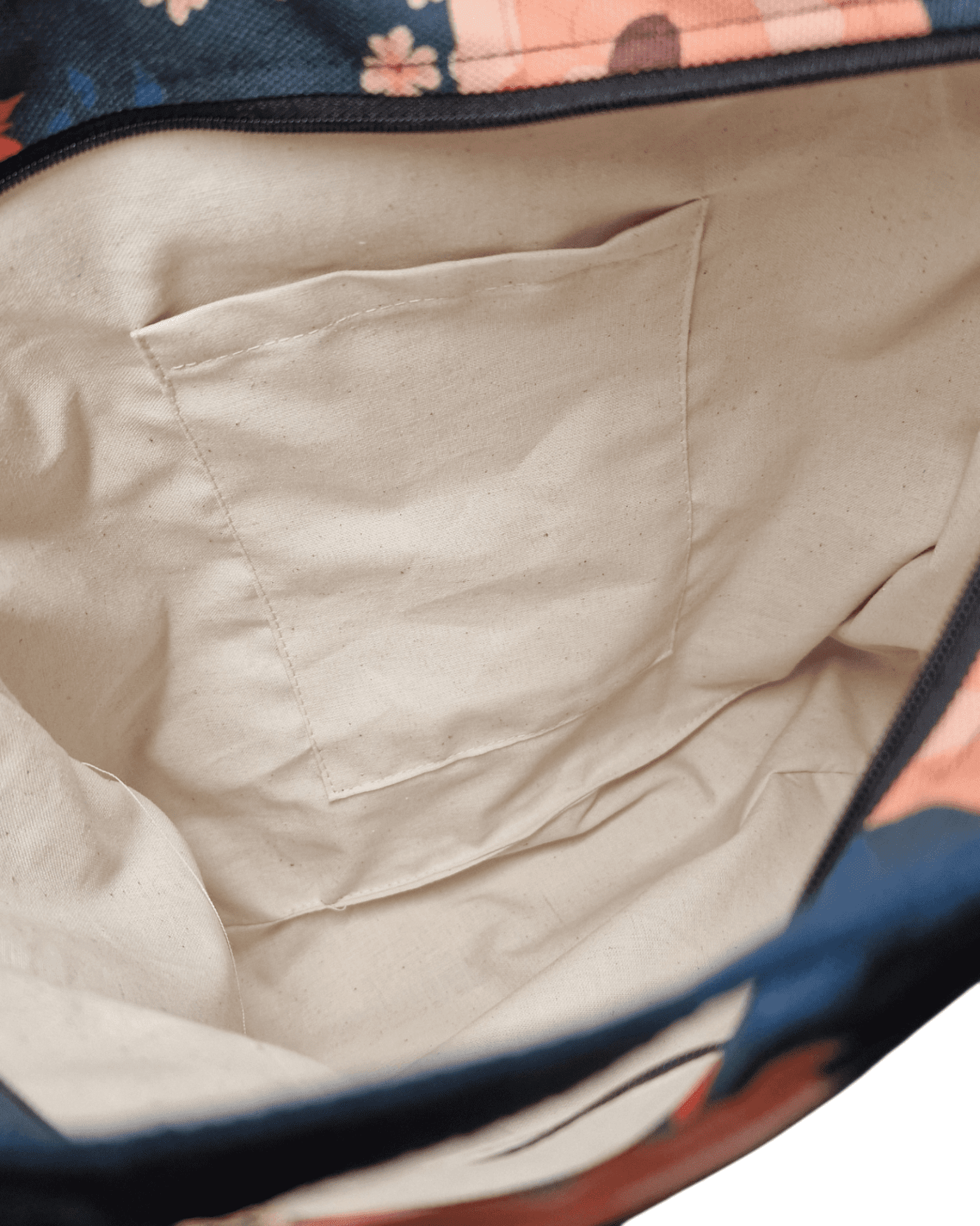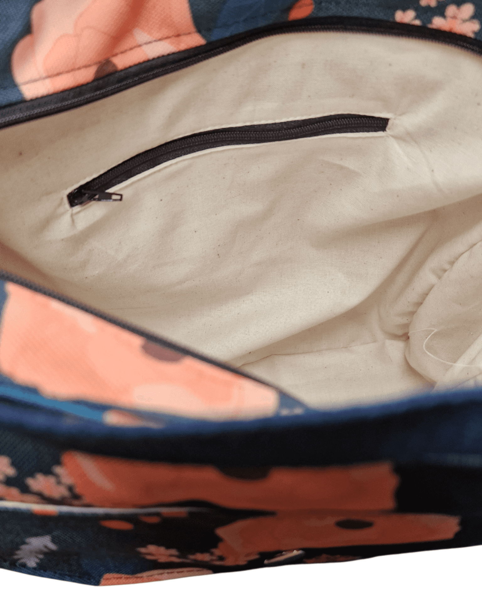 Le modèle Prairie d’Or est confectionné dans une toile de coton épaisse et imperméable, sublimée par un motif fleuri aux tons bleu profond et ocre doré. L’intérieur est entièrement doublé en coton pour une tenue impeccable et une durabilité optimale.