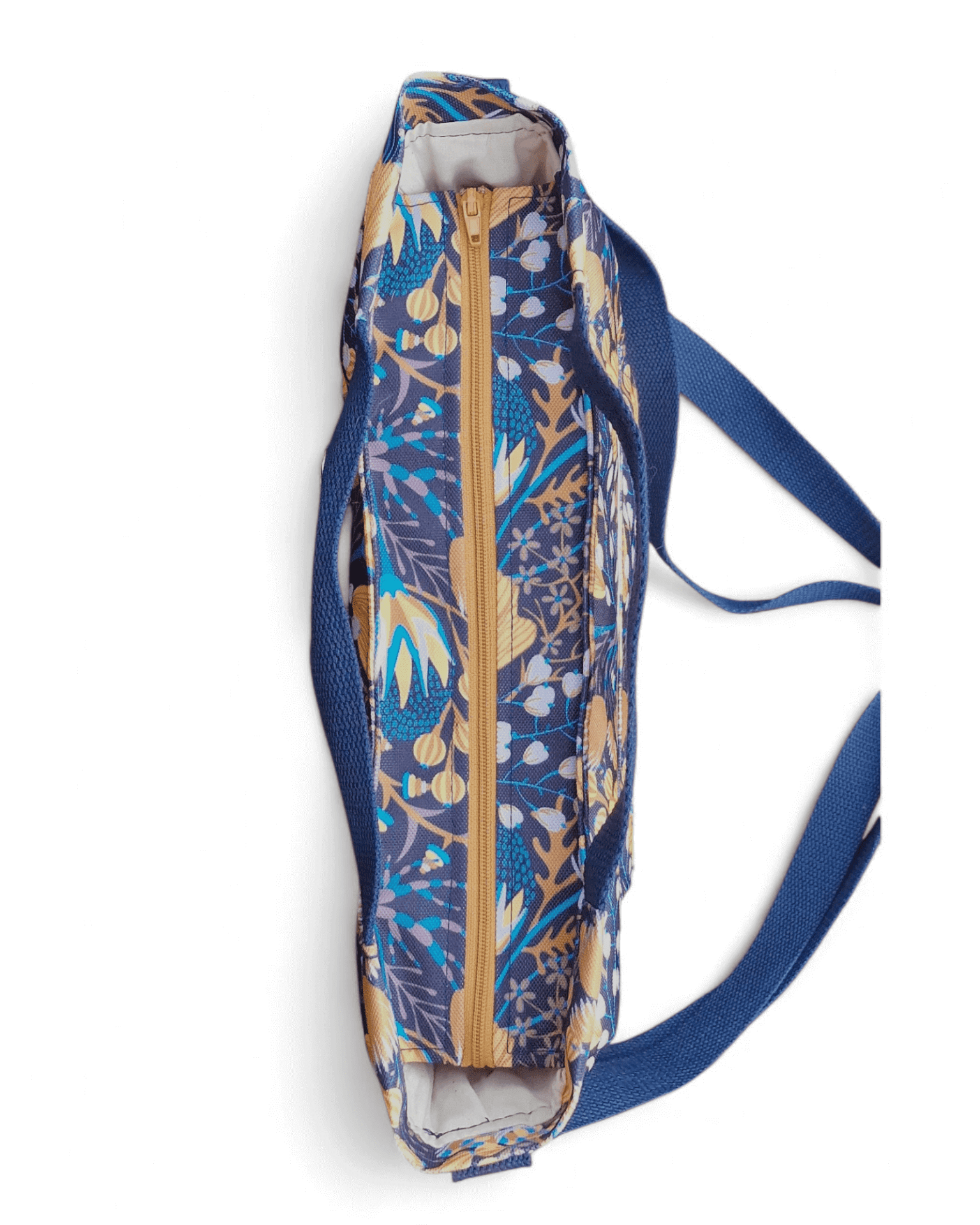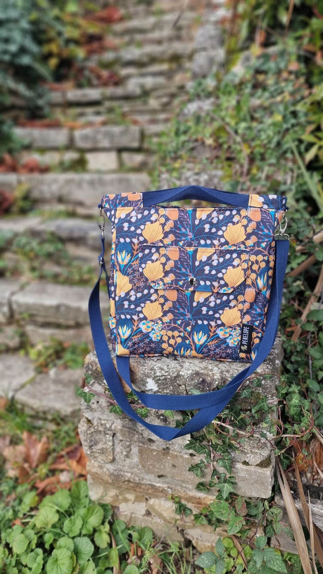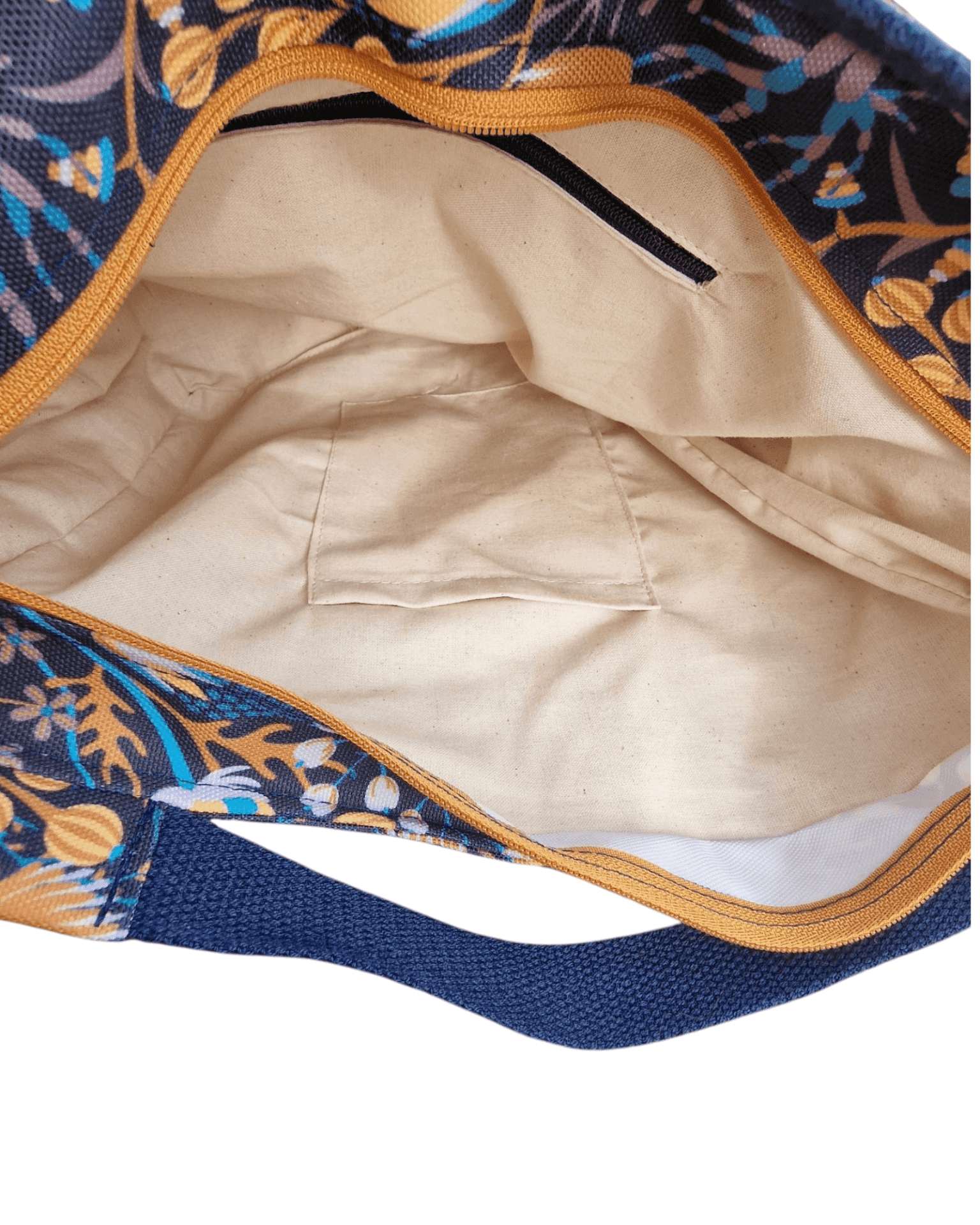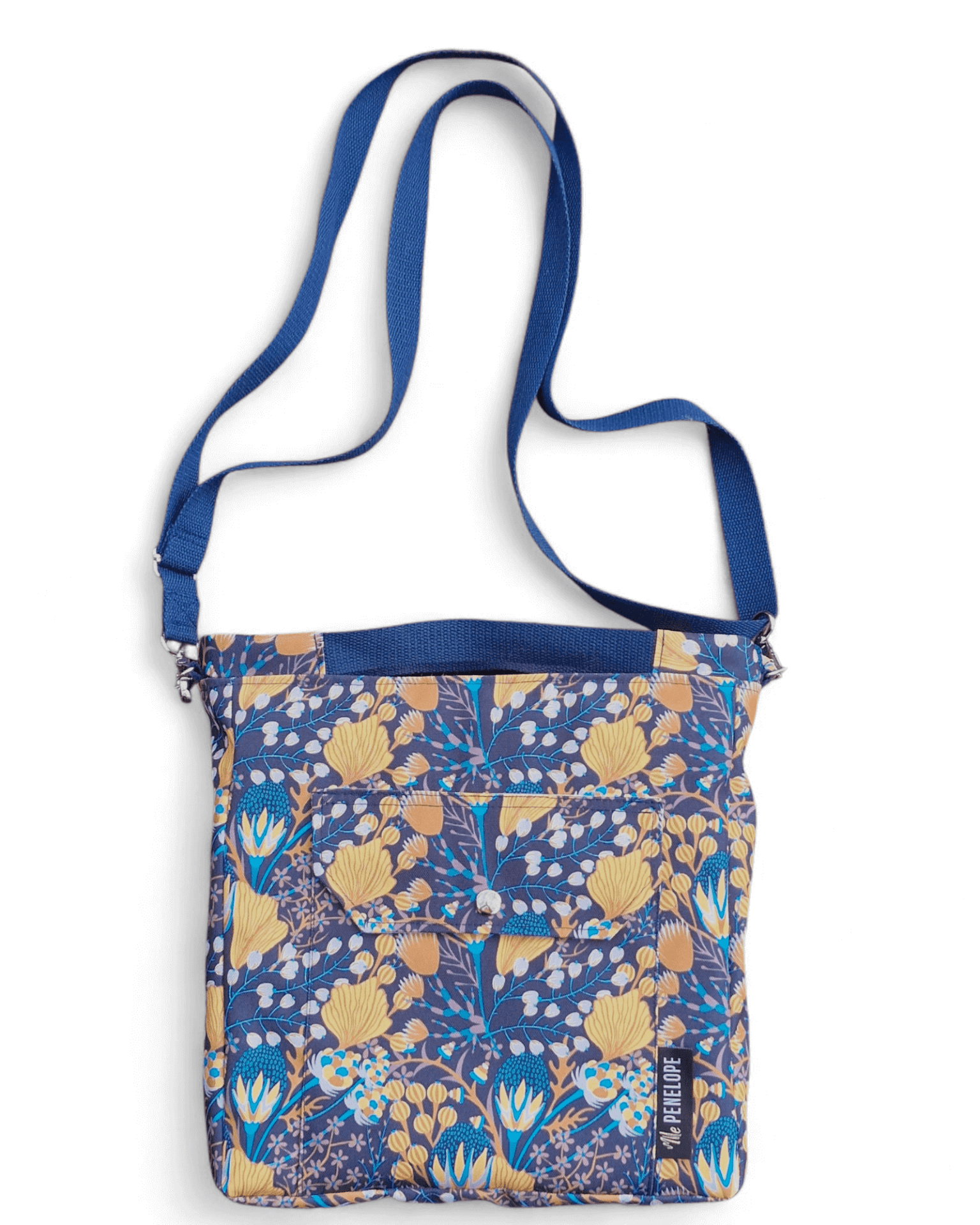 Le modèle Prairie d’Or est confectionné dans une toile de coton épaisse et imperméable, sublimée par un motif fleuri aux tons bleu profond et ocre doré. L’intérieur est entièrement doublé en coton pour une tenue impeccable et une durabilité optimale.