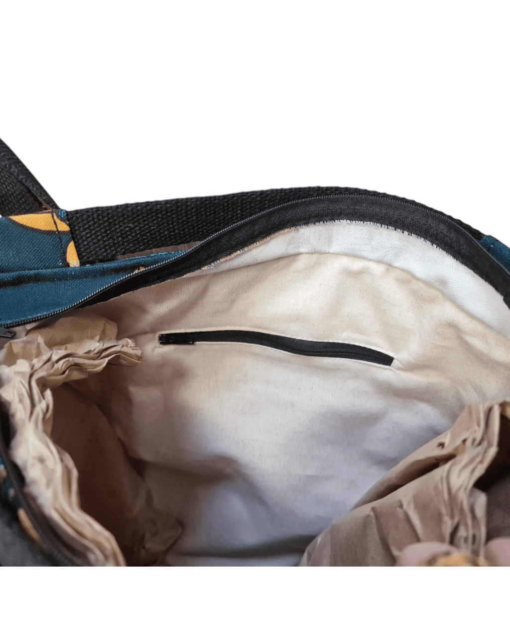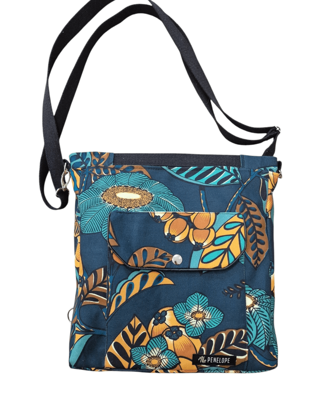 Modèle en toile de coton bleue canard avec de grosses fleurs et feuillages moutardes, bleu, marron et blanc. Les anses sont noires et la doublure est beige claire.