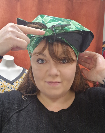 Turban réversible en wax vert, noir et ocre en recto et uni noir sur le verso. 100 % coton