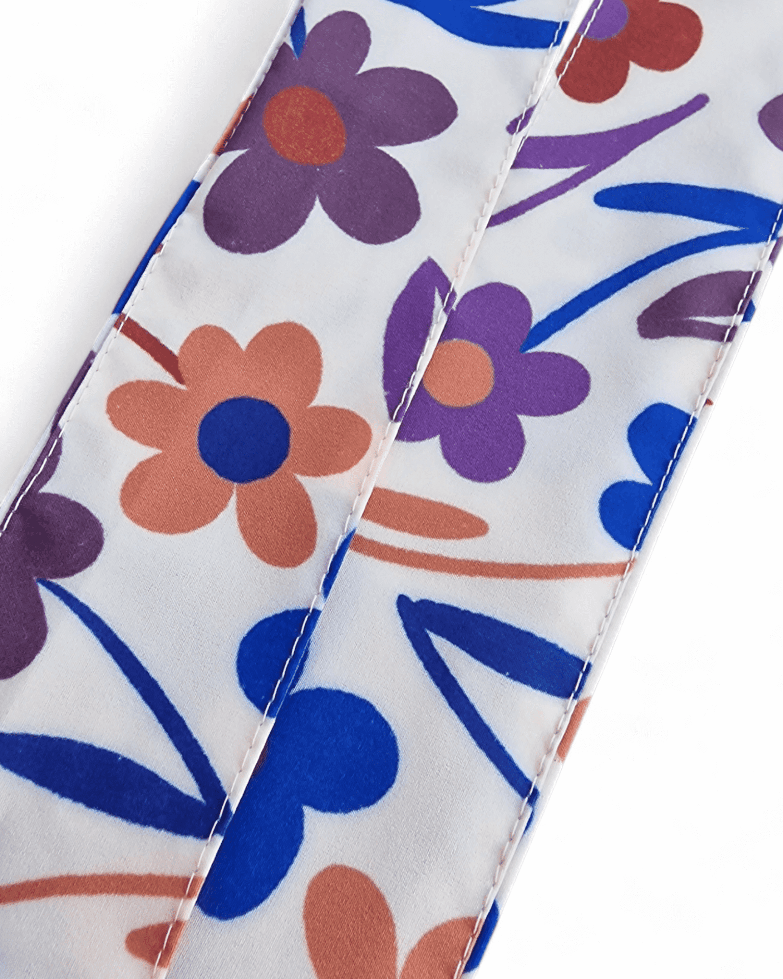 Son imprimé floral graphique aux tons bleu roi, lilas et terracotta sur fond clair apporte une touche pop, joyeuse et résolument fraîche à toutes vos coiffures.