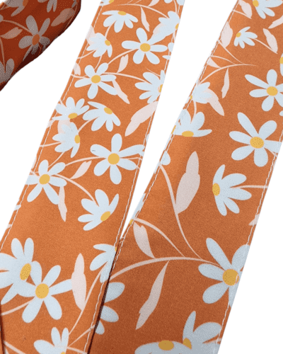 Serre-tête Boho déhoussable et lavable au motif de marguerites blanches sur fond corail lumineux. Léger, confortable et facile à porter, il apporte une touche solaire et estivale à toutes vos tenues.