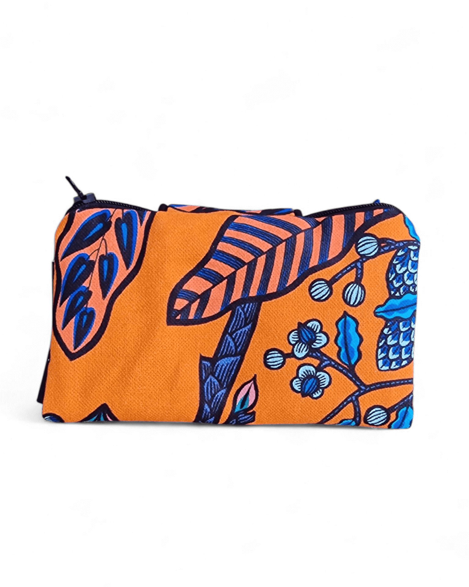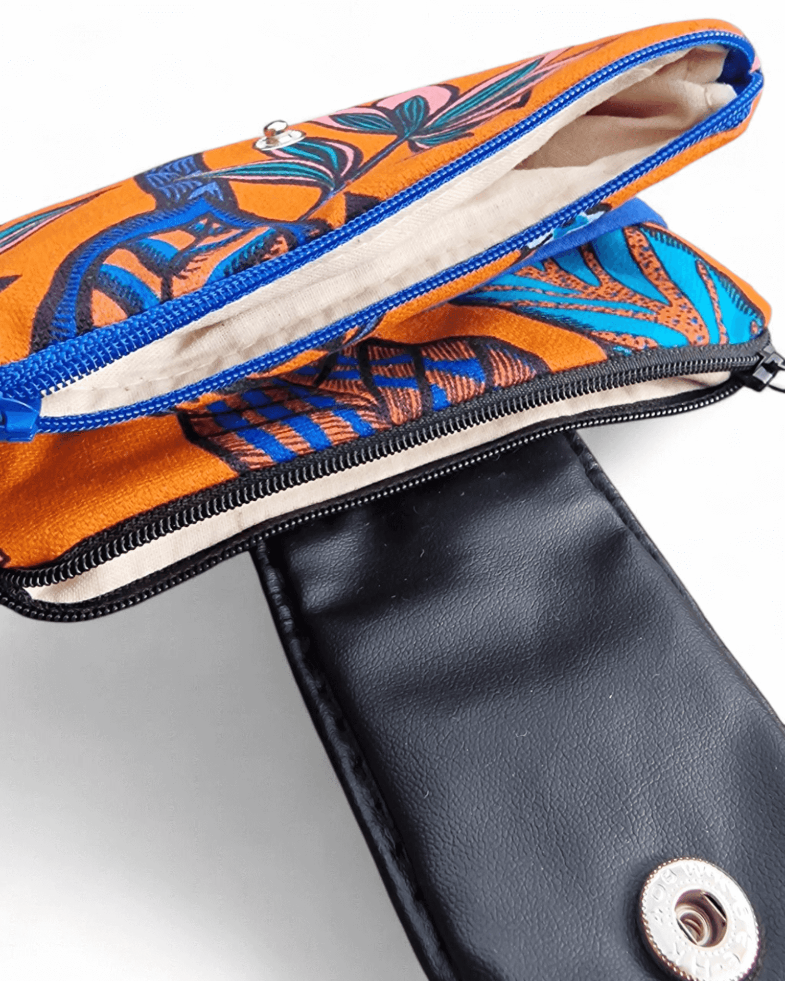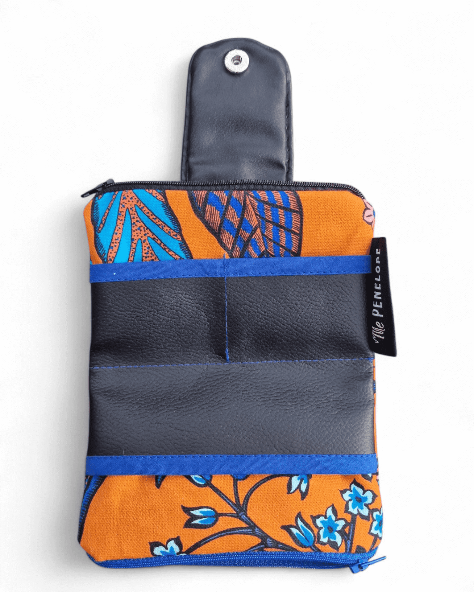 Le modèle Ariel se distingue par une toile de coton épaisse, lumineuse et vibrante, mêlant orange chaud, bleu profond et touches roses. Chaque portefeuille est réalisé artisanalement, en petite série, ce qui rend chaque pièce unique.