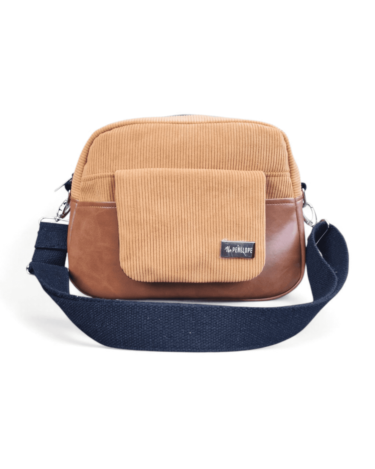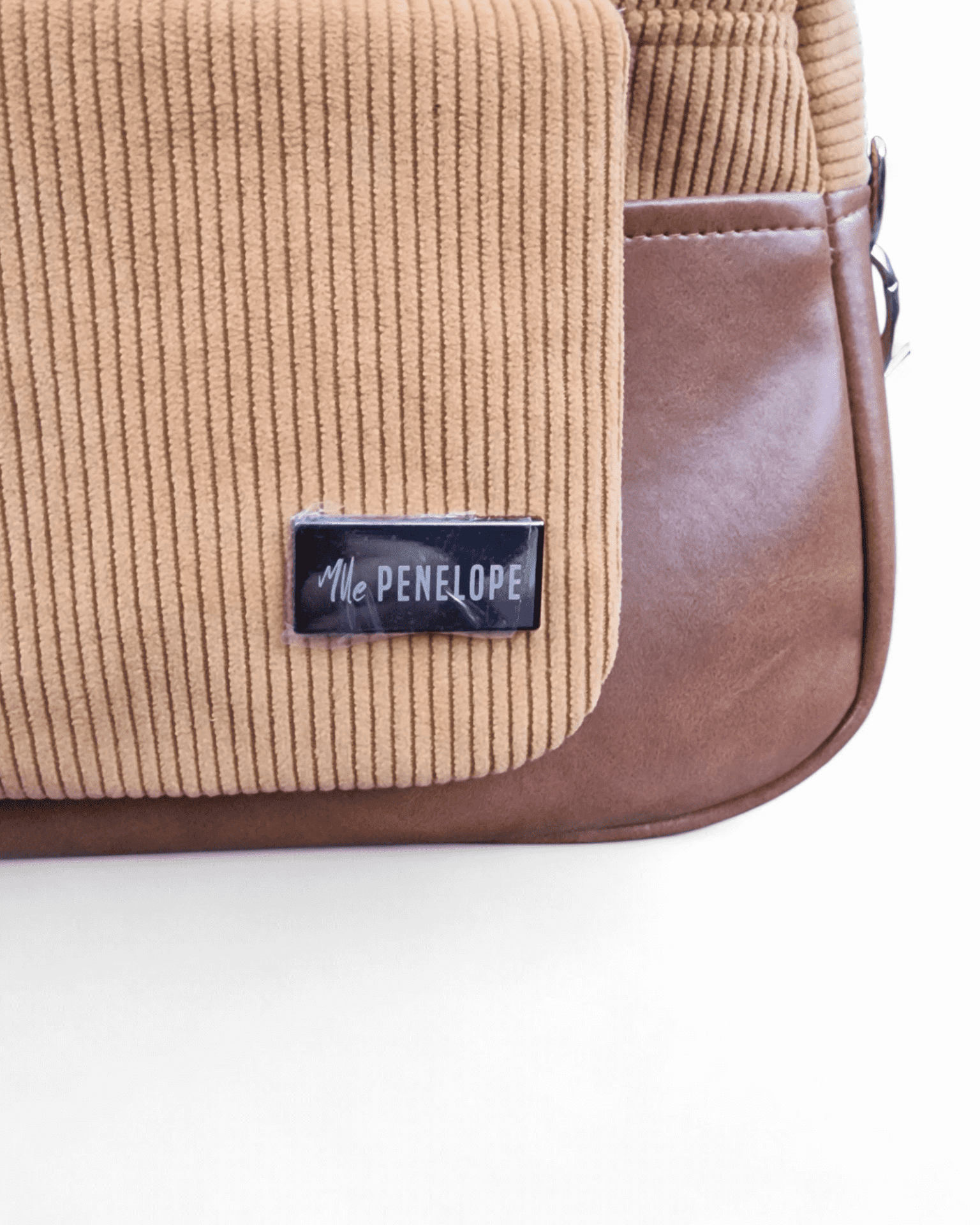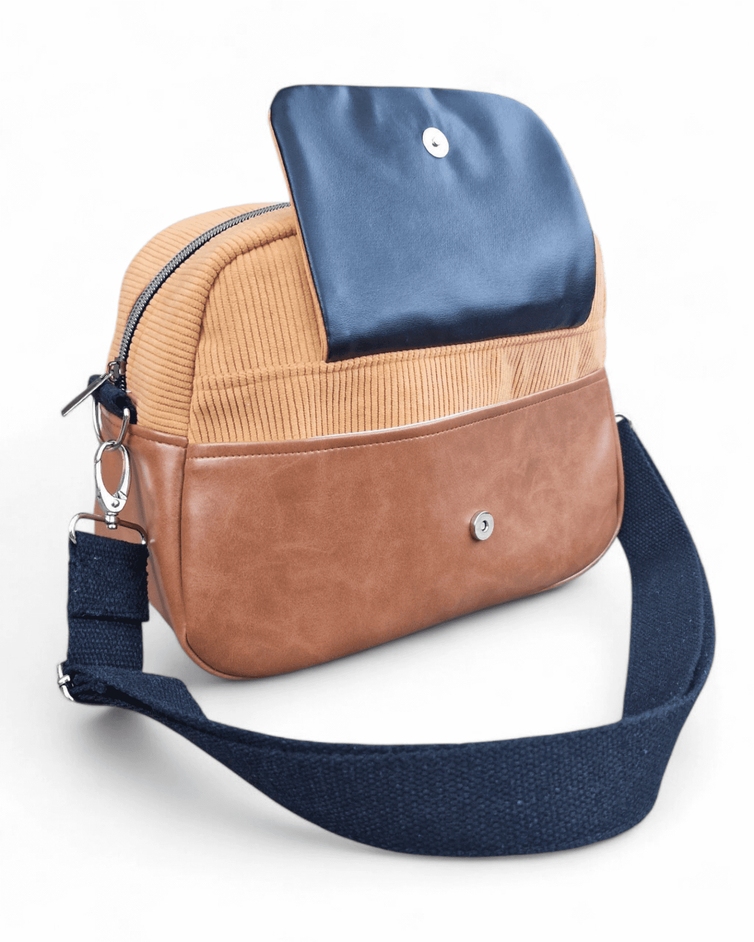 🧵 Matières : velours côtelé jaune miel, simili cuir camel, doublure coton