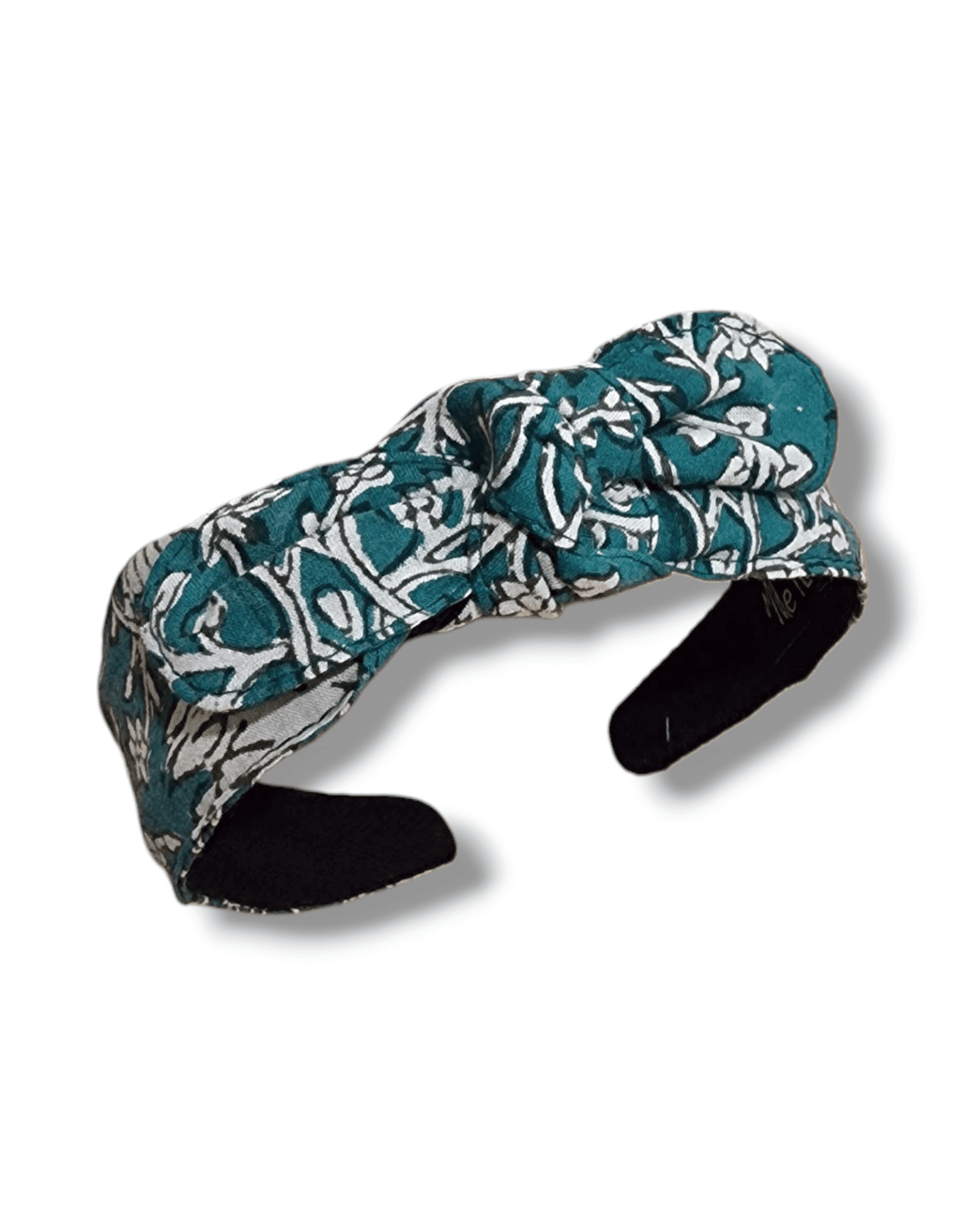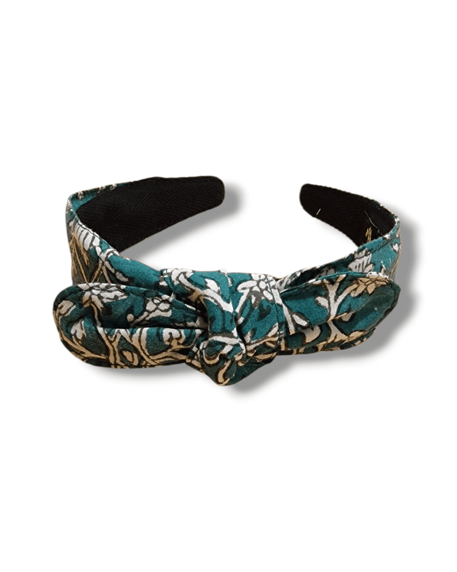Ce serre-tête Noué en coton block print indien séduit par ses motifs floraux délicats et sa teinte vert, entre élégance et exotisme