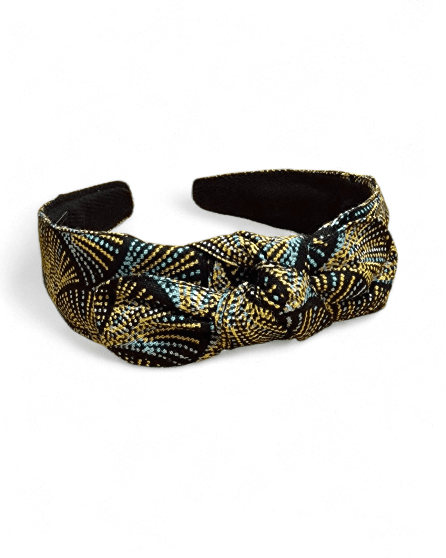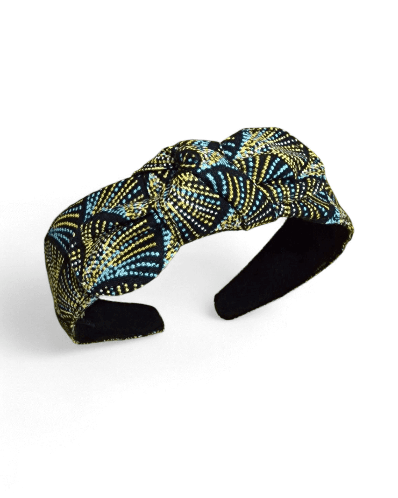 Graphique et lumineux, ce serre-tête joue sur un motif éclatant façon éventail, mêlant vert, jaune, bleu et noir pour un style audacieux et moderne.