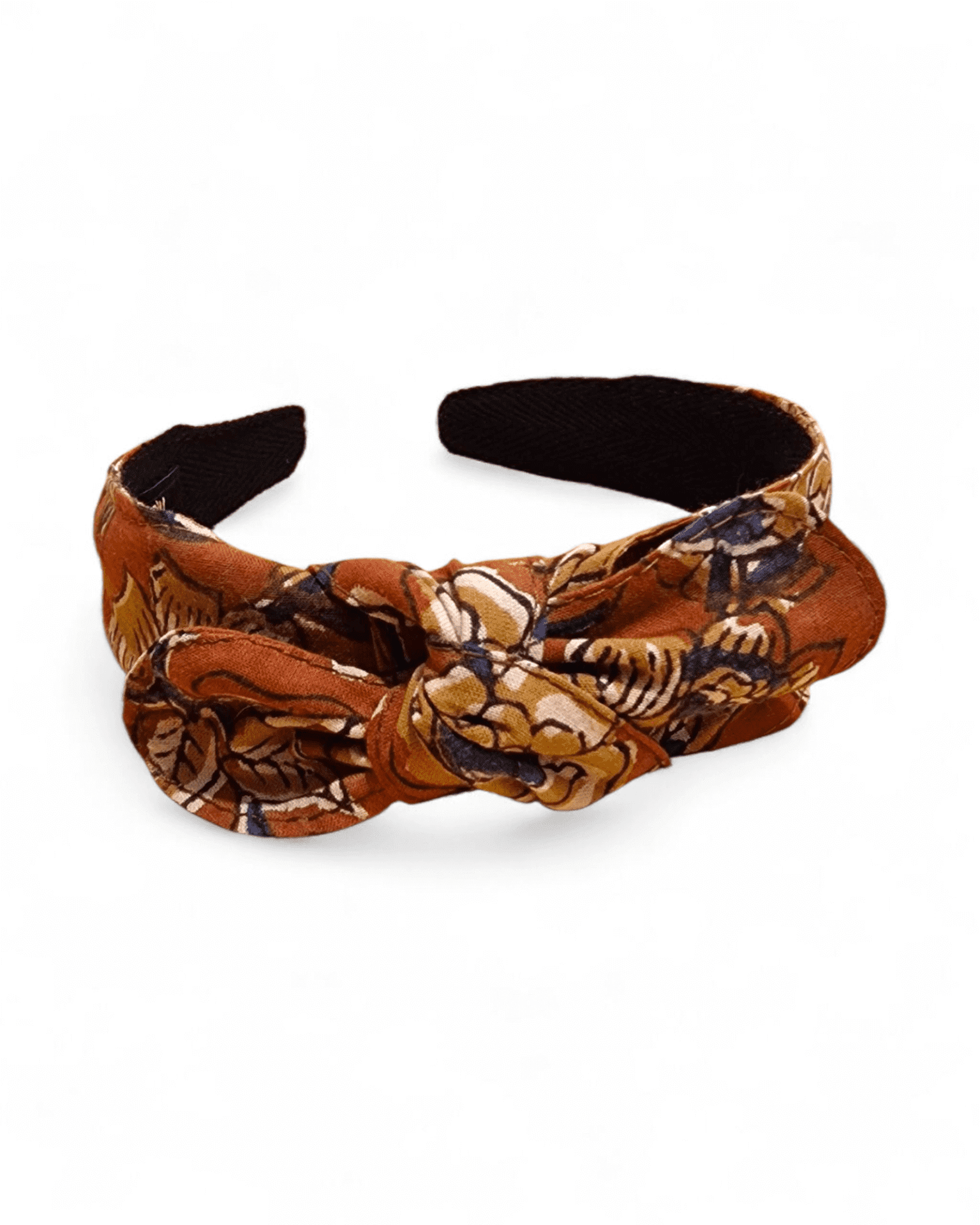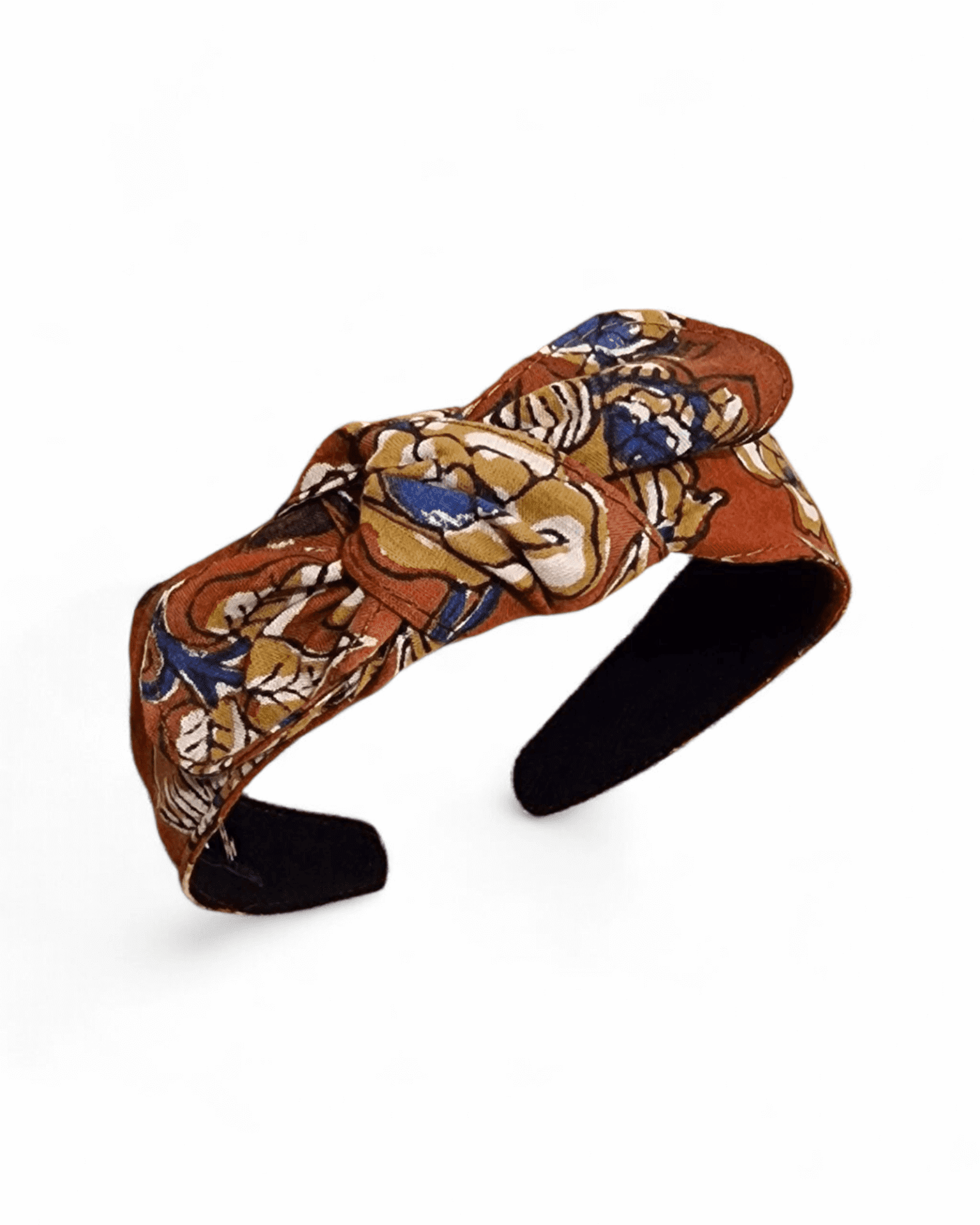 Ce serre-tête Noué en coton block print indien dévoile de grands motifs floraux aux nuances terracotta, moutarde et bleu, pour une touche solaire et raffinée.