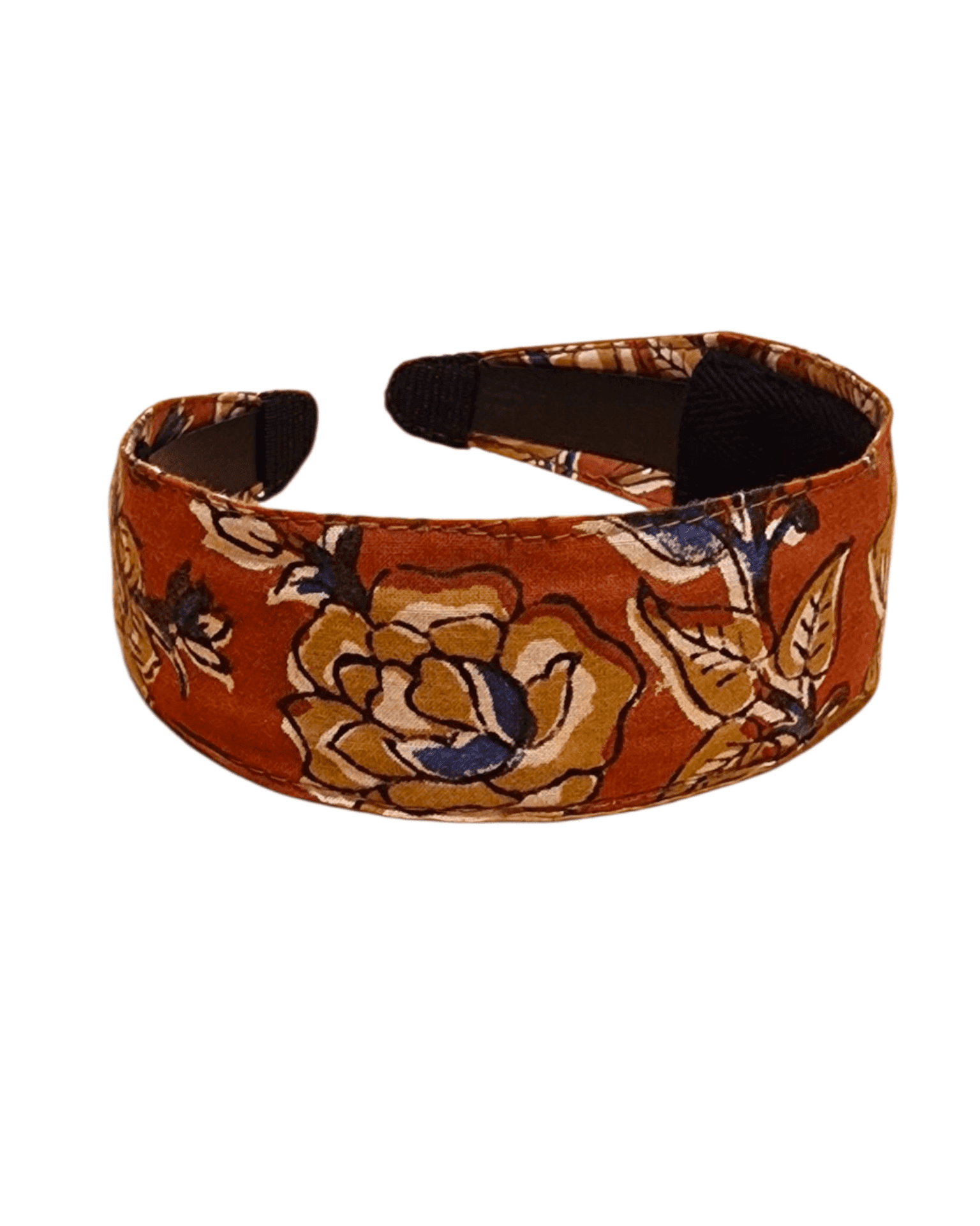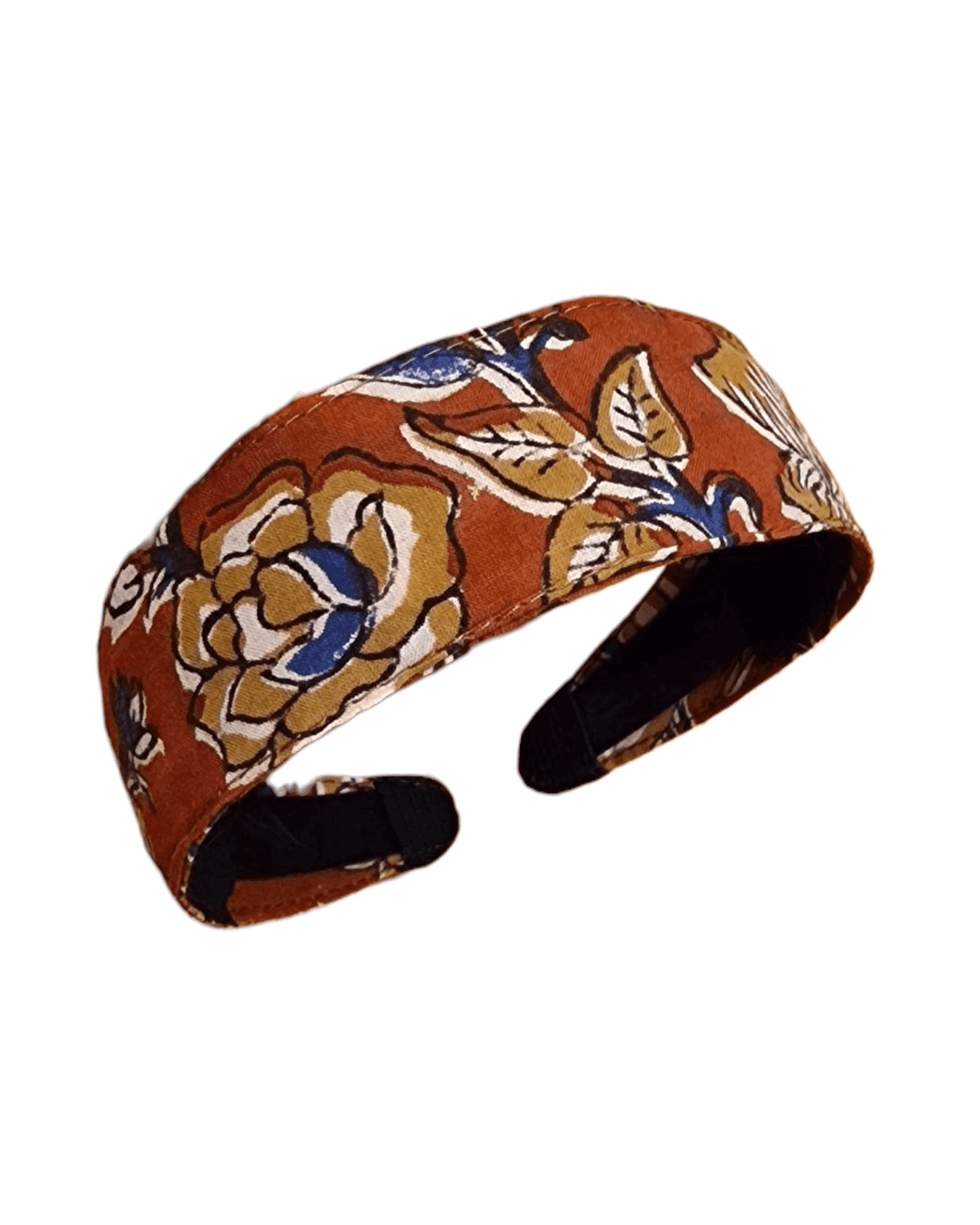 Ce serre-tête en coton block print indien dévoile de grands motifs floraux aux nuances terracotta, moutarde et bleu, pour une touche solaire et raffinée.
