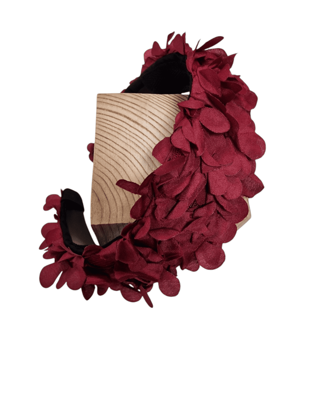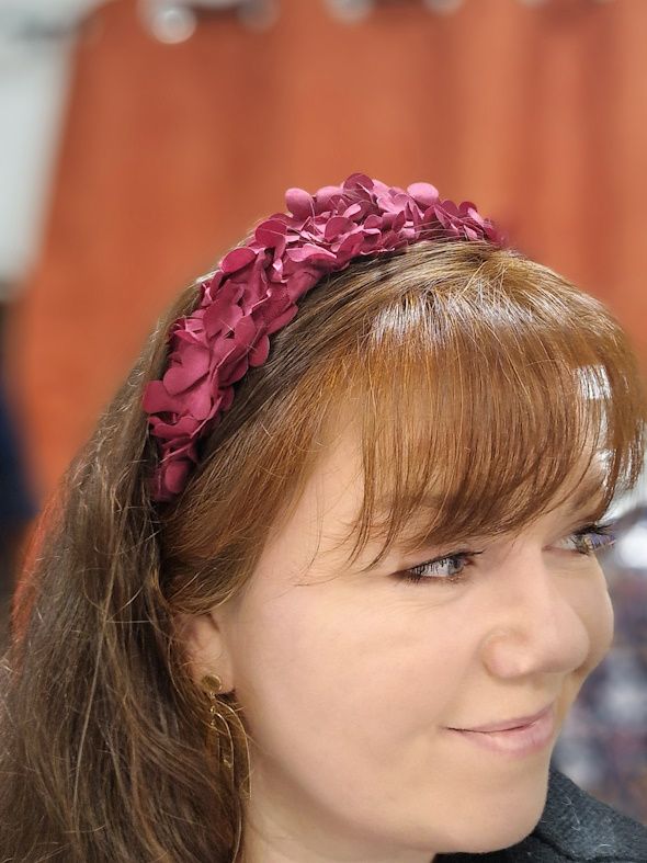 Serre tête bandeau déhoussable de la collection capsule Gossip. Le tissu a des pétales brodées volantes rouges foncées en polyester.
