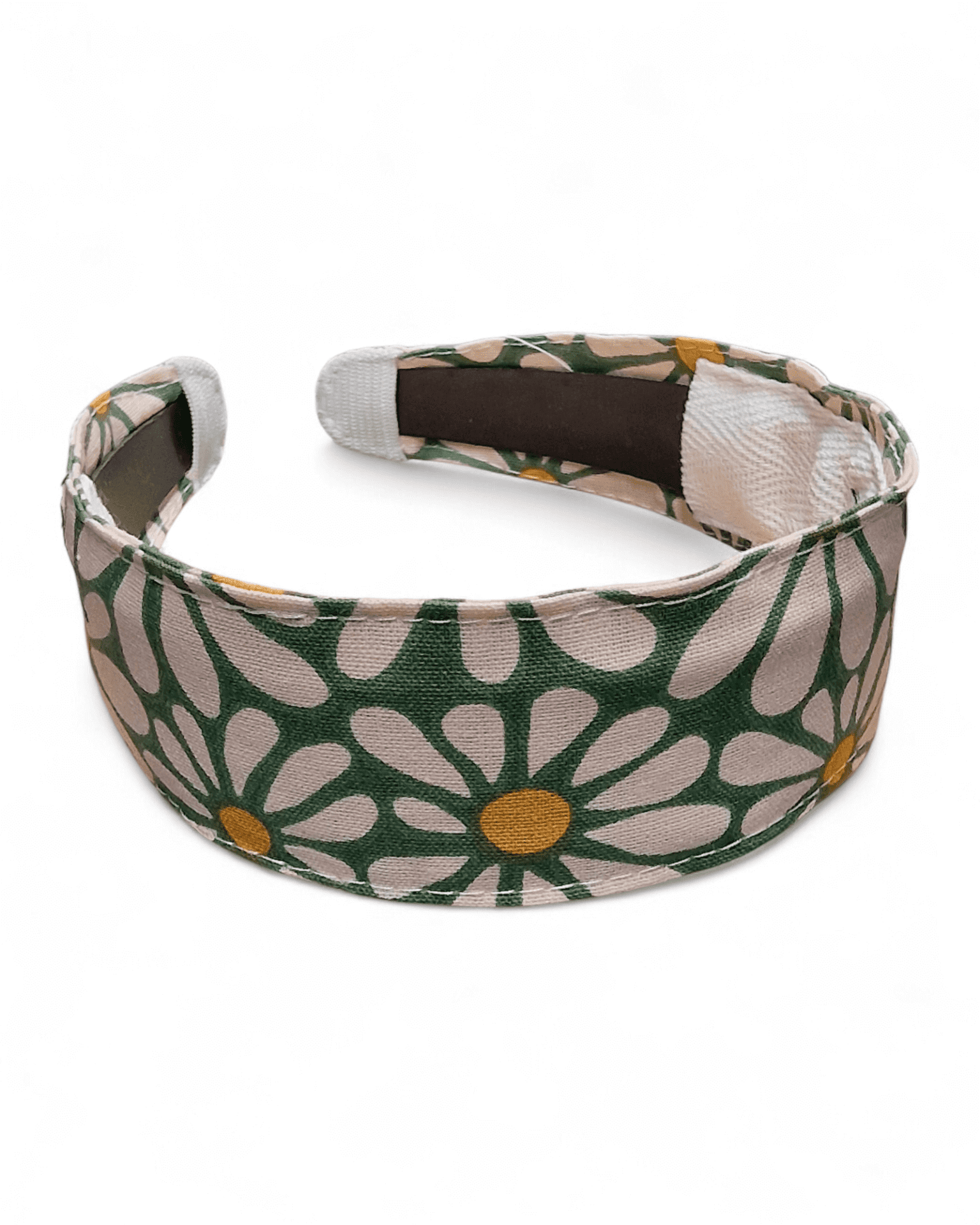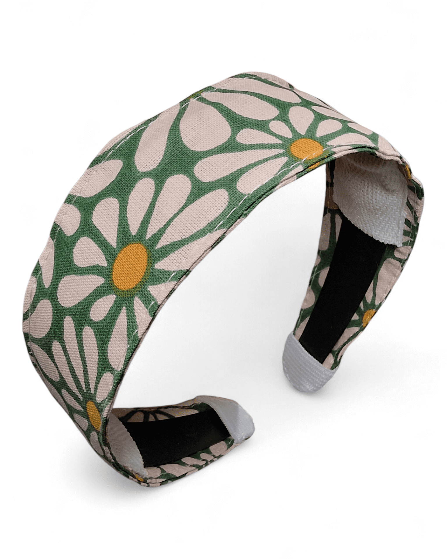 Un motif de grandes fleurs façon marguerites sur fond vert doux, lumineux et naturel. Un serre-tête frais et joyeux qui illumine instantanément le visage.