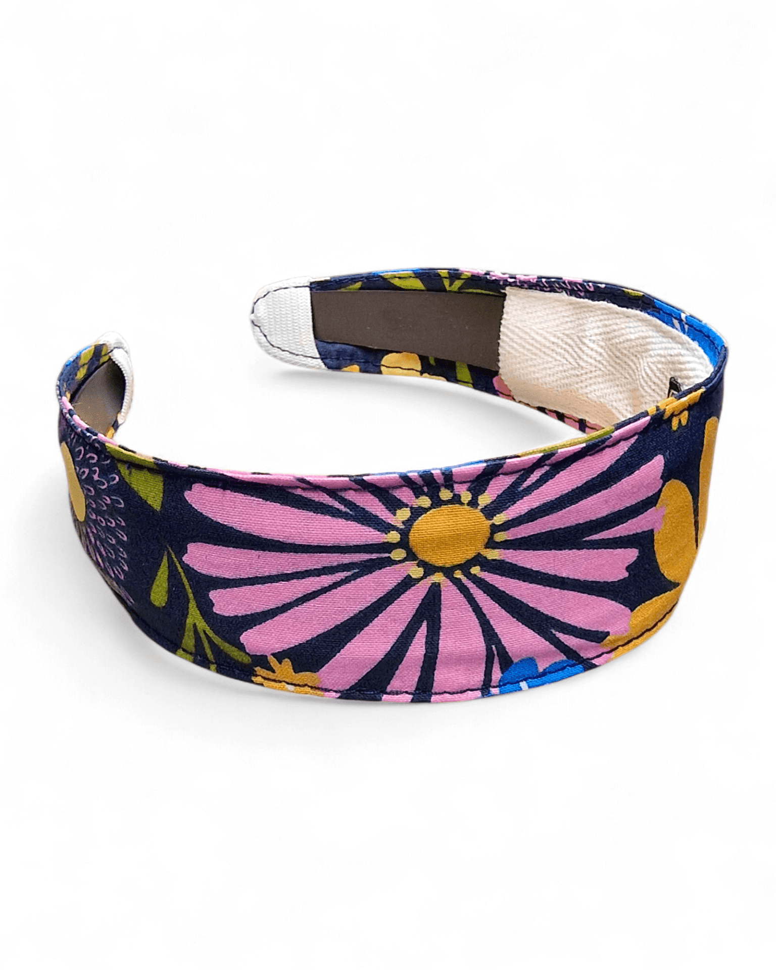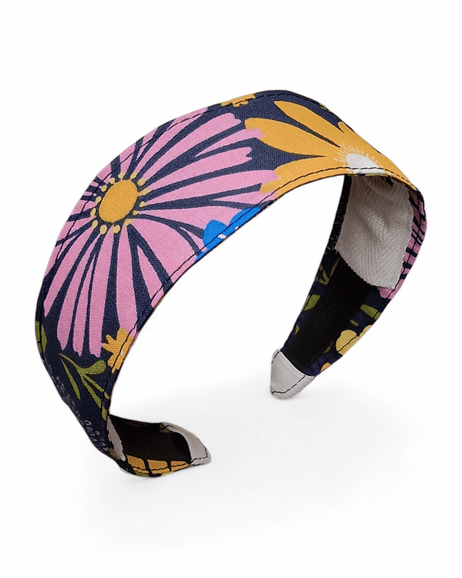 Un imprimé floral éclatant mêlant rose, jaune et bleu profond pour une coiffure pleine de lumière. Soléna apporte une touche joyeuse et moderne à toutes vos tenues.