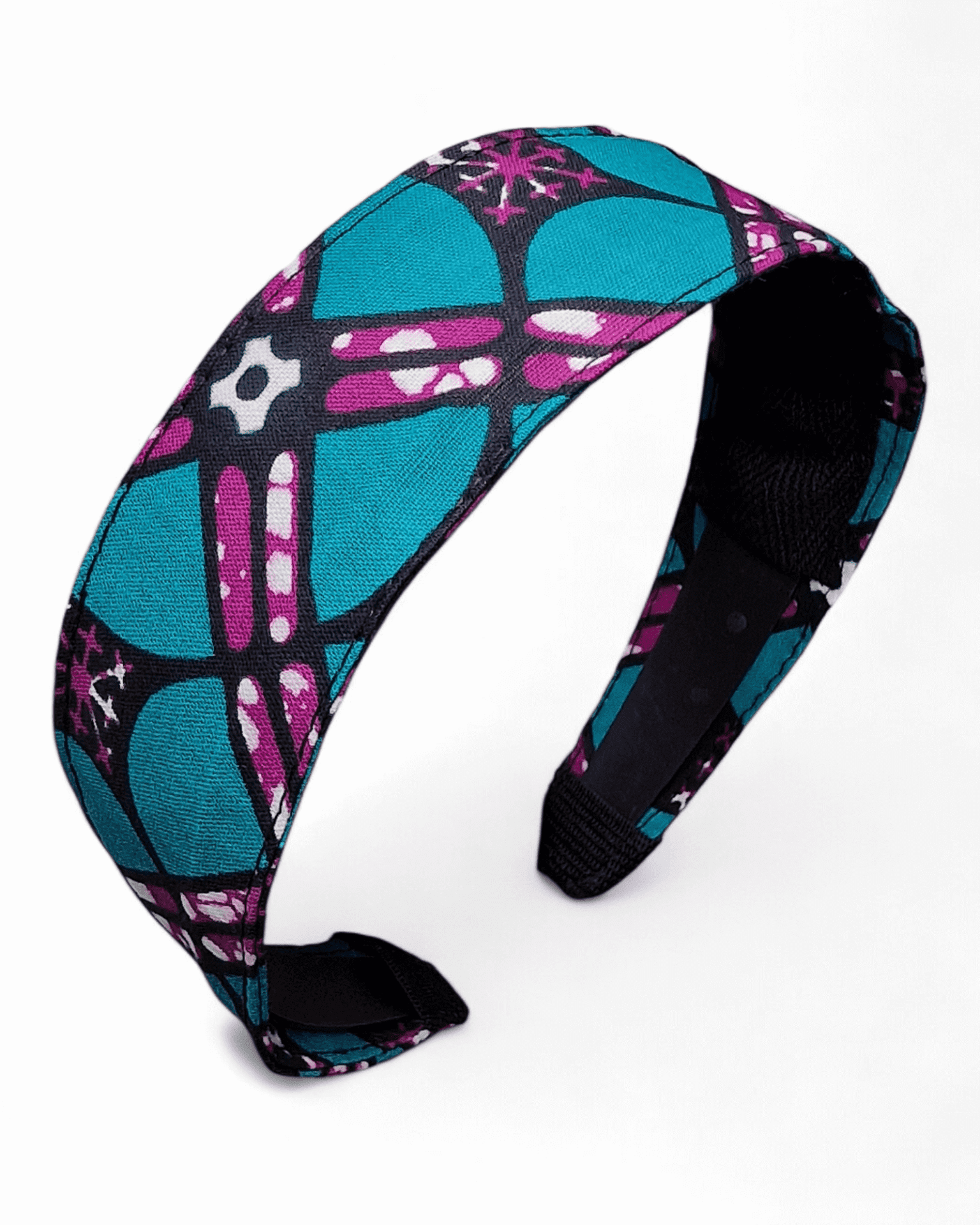 Un imprimé wax graphique mêlant turquoise profond et touches fuchsia pour une coiffure vibrante et moderne. Malika apporte caractère et originalité au quotidien.