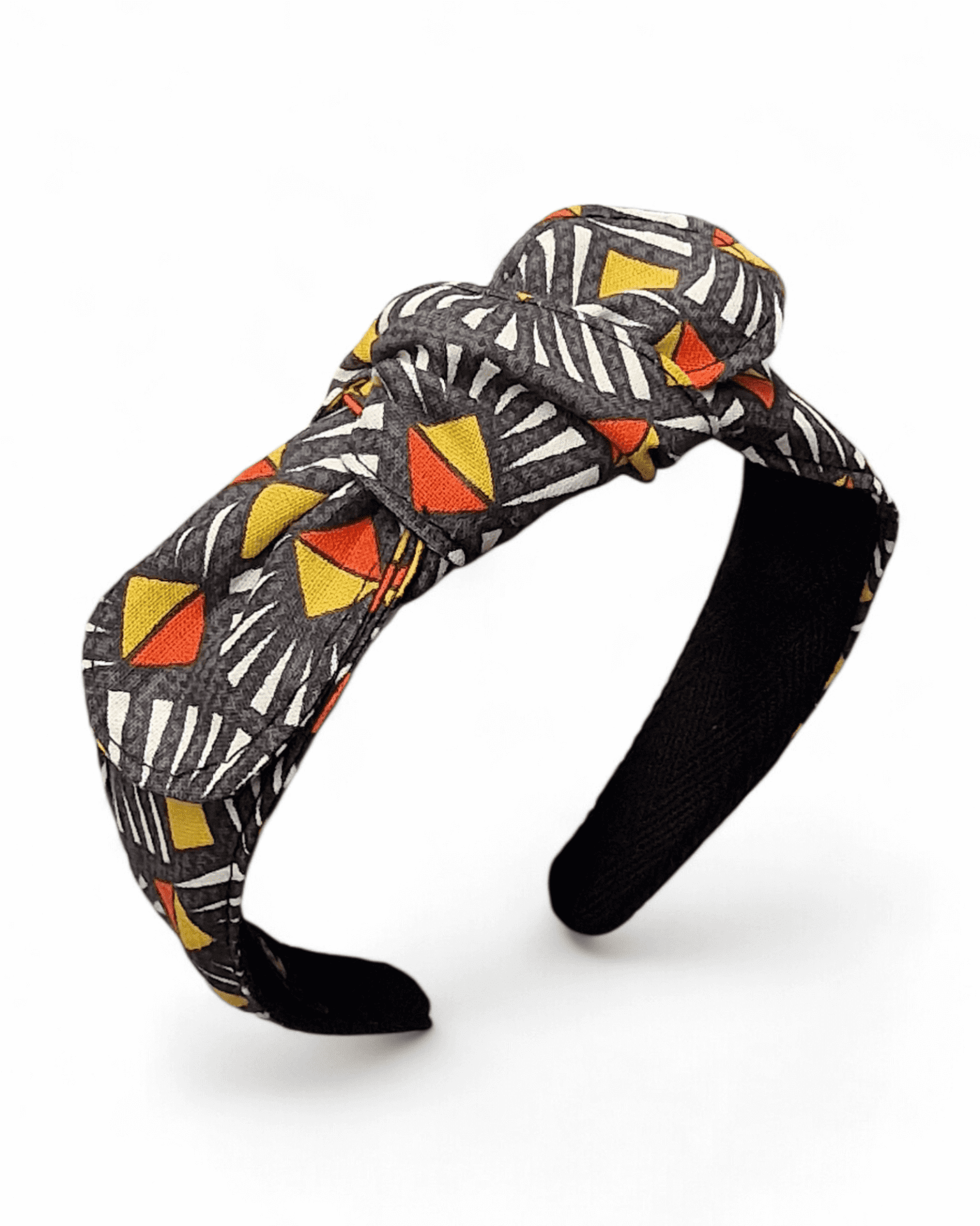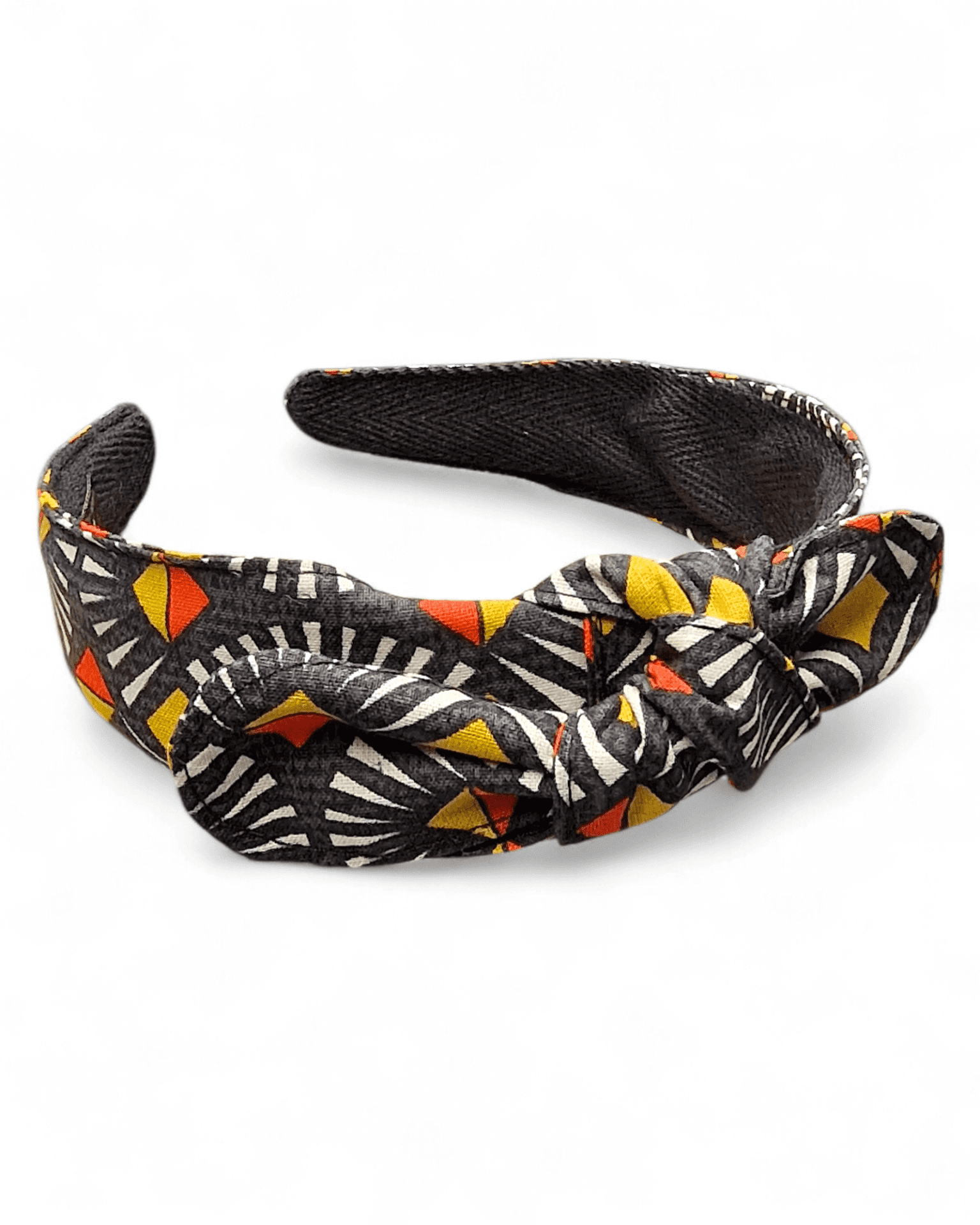 Serre-tête noué Atlas au motif graphique et structuré. Ses touches chaleureuses contrastent avec un fond profond pour une allure moderne et élégante, facile à porter au quotidien.