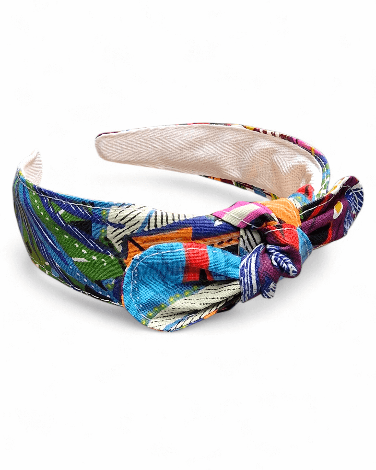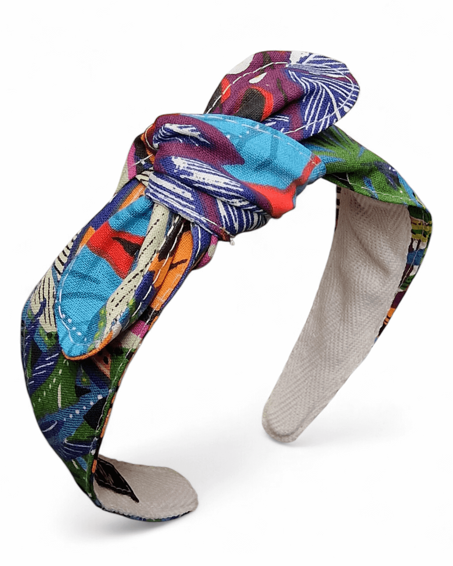 Version nouée du modèle Copacabana, ce serre-tête séduit par son imprimé graphique et vibrant mêlant couleurs tropicales et motifs dynamiques. Son nœud apporte du volume et une touche solaire idéale pour réveiller toutes les coiffures.