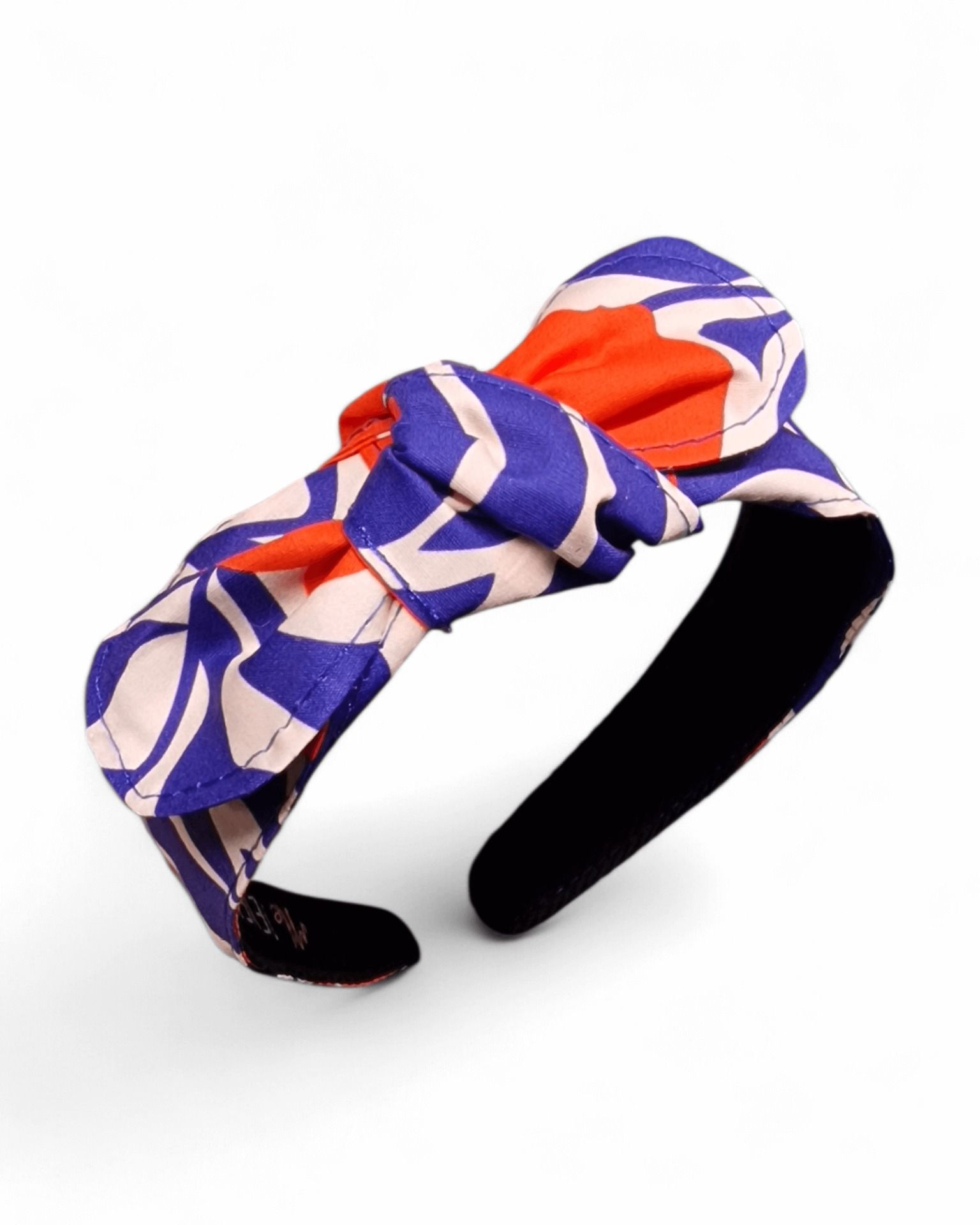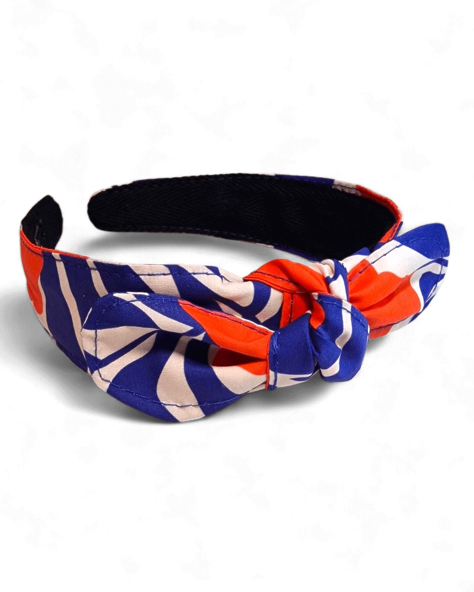 Serre-tête noué au motif coquelicot graphique bleu, écru et corail. Confortable et léger, il est entièrement cousu sans colle pour un maintien agréable derrière les oreilles. Un accessoire cheveux original, idéal pour les amoureuses du coquelicot.