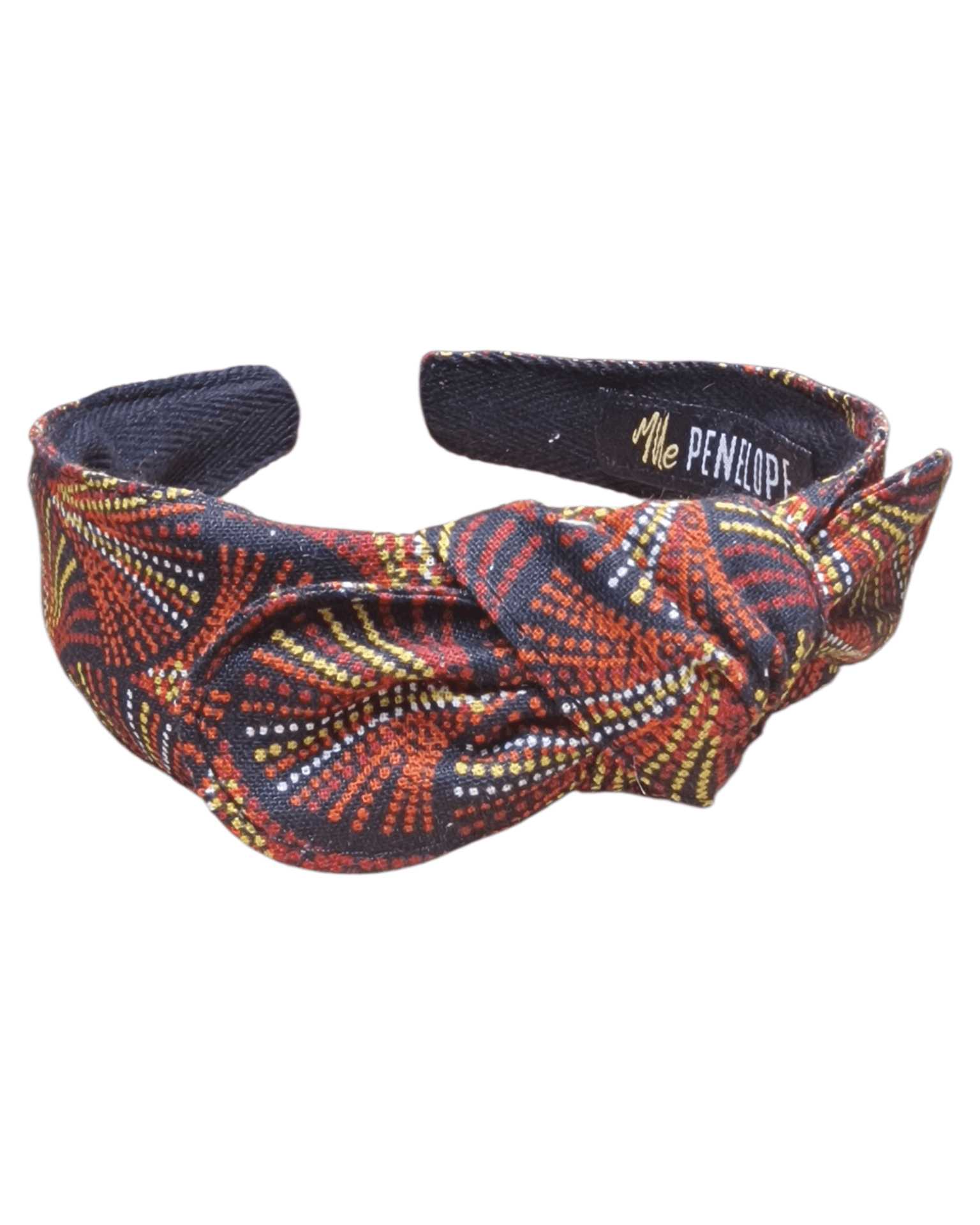 Serre-tête noué au motif graphique et lumineux, mêlant noir profond, terracotta et touches dorées. Une pièce de caractère qui structure la coiffure en un instant tout en restant facile à porter au quotidien.