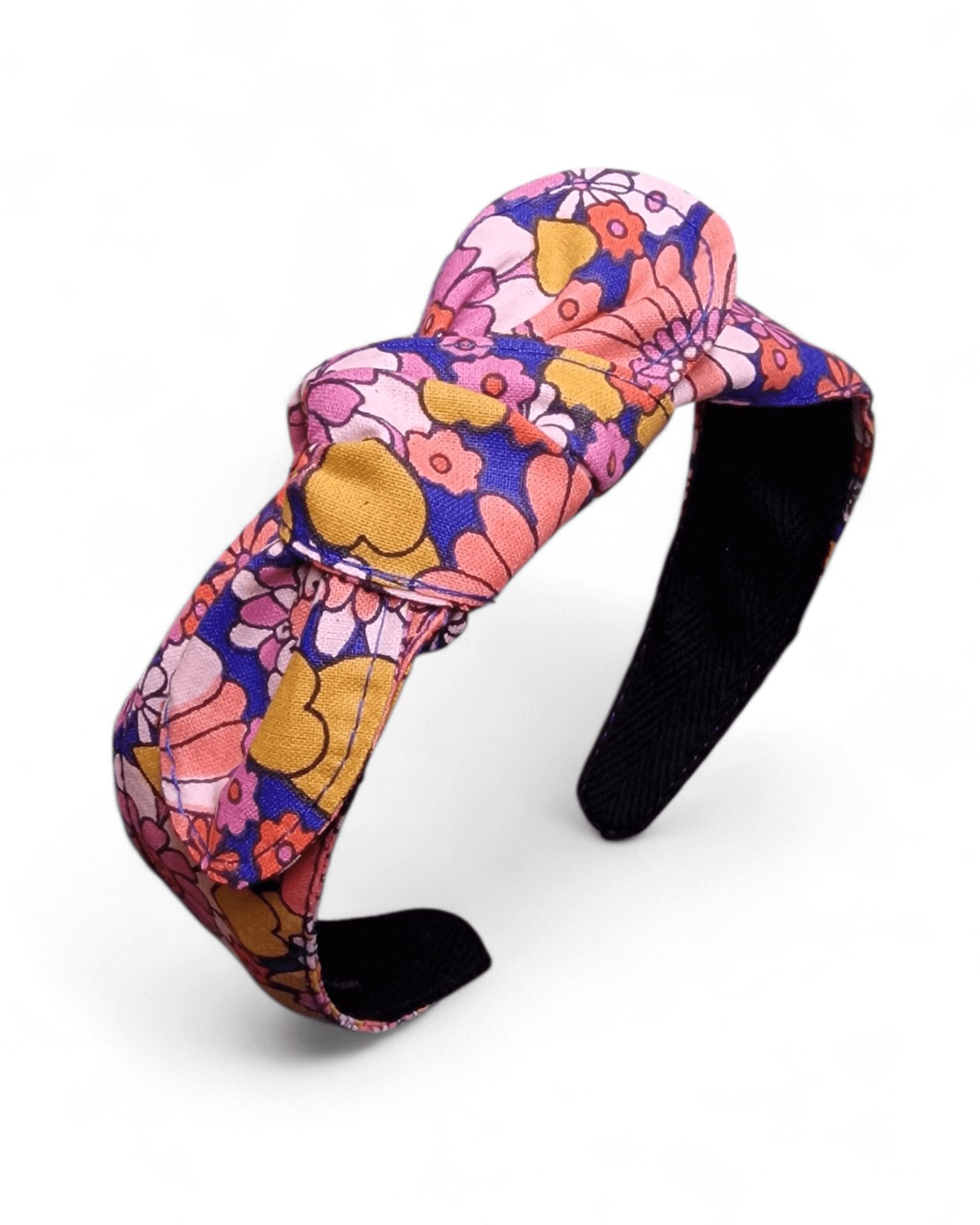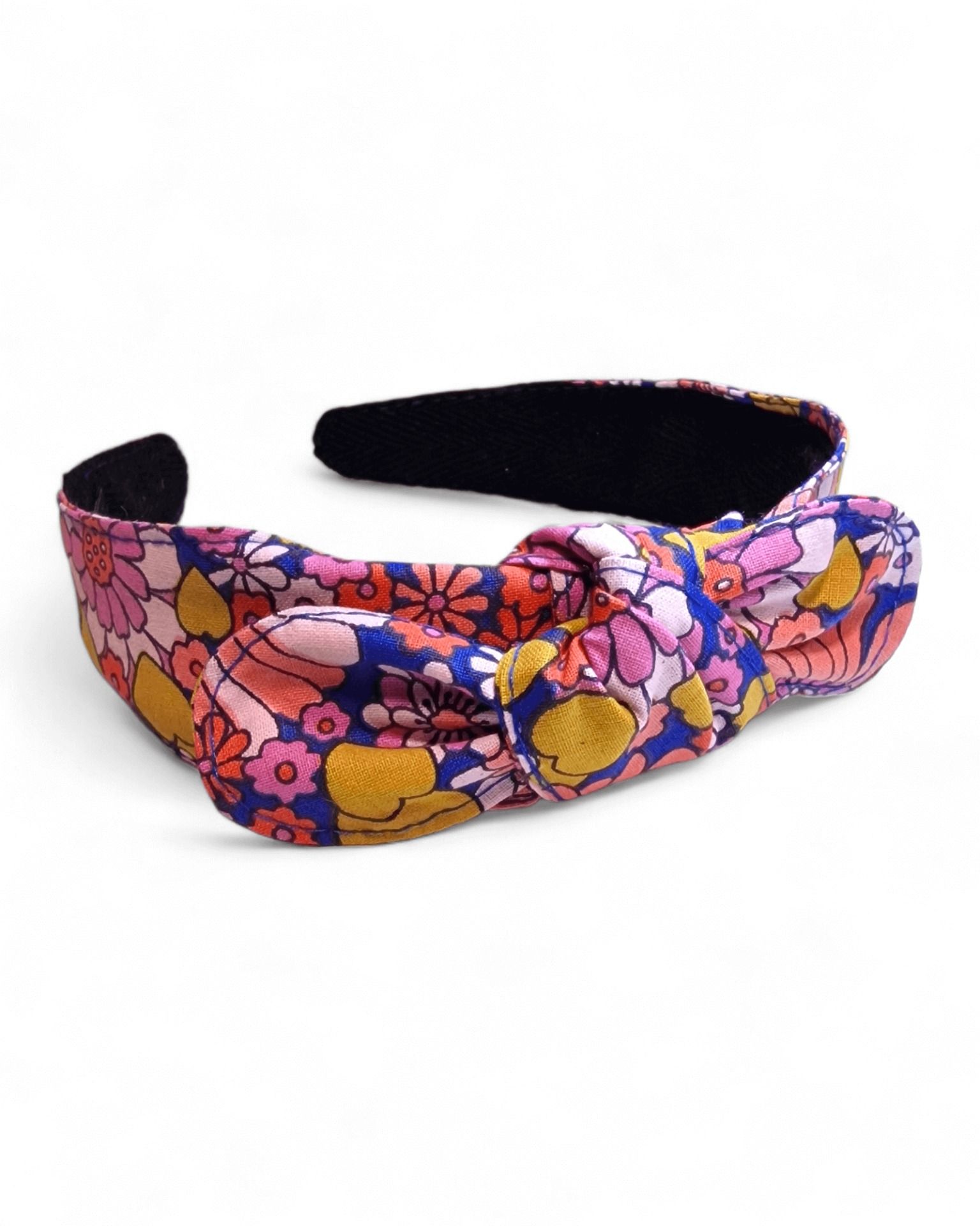 Serre-tête noué à motif floral rétro, confectionné en France avec des finitions soignées. Confortable et élégant, il apporte une touche colorée à toutes vos coiffures. L’accessoire idéal pour un look chic et féminin.