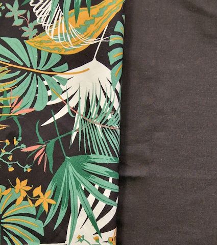 Turban réversible imprimé feuillage tropique et uni noir sur le verso. 100 % coton